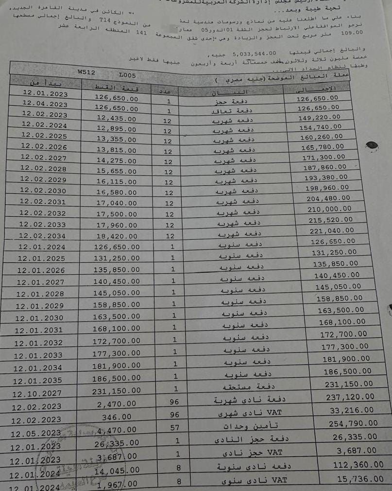 تقسيط ع 12 سنه قسط شهري : 12,435 قسط سنوي :126,560 المدفوع : مليون 135 الف المقدم بالاوفر : 3 مليون
