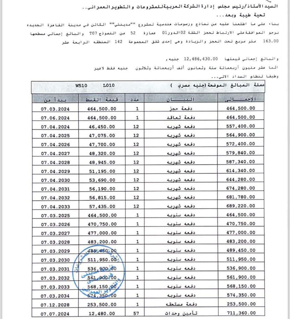 مجموعة 142 منطقة B14 - الدور الاول موقع متميز – فيو مفتوح من الواجهتين – مجري السيل ووايد جاردن المساحة 163 متر مربع: رسبشن 3 قطع + 2 غرف نوم + 1 غرفة ماستر شامل دريسنج + مطبخ + 3 حمام اجمالي قيمة العقد: 12,486,430 جنيه اجمالي المدفوع: اقساط 2,233,350 + صيانة 149,760 = 2,383,110 جنيه الاوفر: مليون جنيه متبقي اقساط تصاعيدية حتي الربع الاول من عام 2034