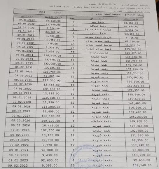 حجز 1/2022 ب اجمالي 3 مليون 456 تقسيط ع 12 سنه قسط شهري 9000 قسط سنوي 92000